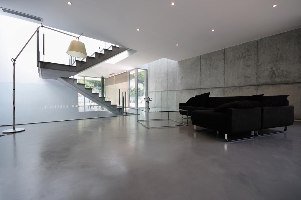 En este caso se ha escogido un cemento pulido para el pavimento, y se han dejado a la vista algunas paredes de hormigón y las propias escaleras, que lucen gracias a la estructura de vidrio que las deja a la vista.
